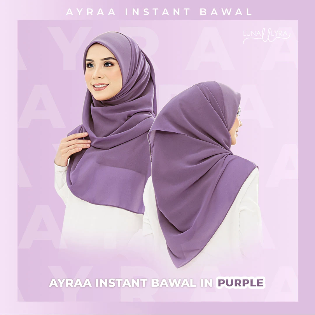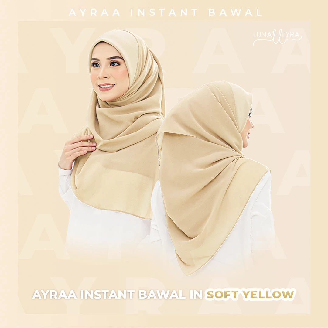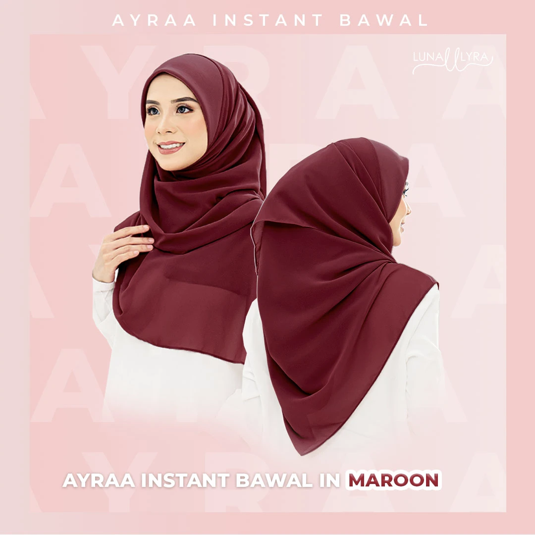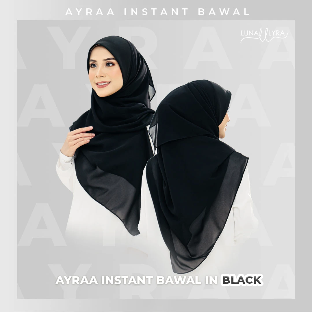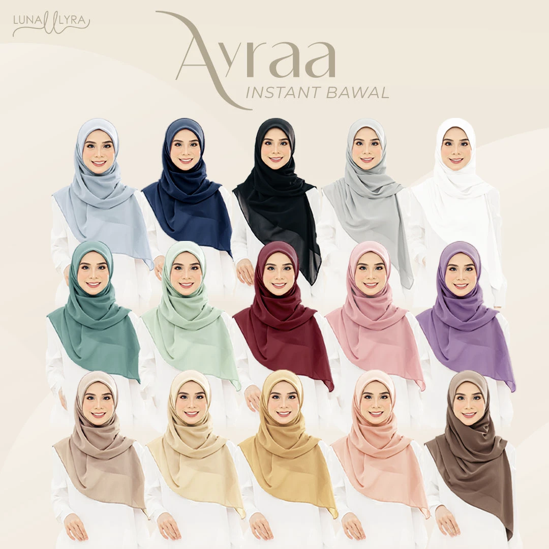Tudung bawal Instant berukuran 50" yang diperbuat daripada material heavy chiffon dan awning material scuba. Ayraa Instant Bawal mudah digosok, sejuk, tak jarang dan tidak mudah kedut. Gosok sekali sahaja, pakai berkali-kali.